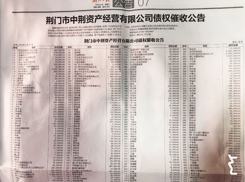 市中荊資產(chǎn)公司在湖北日報刊登債權(quán)催收公告